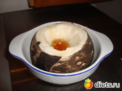 Как приготовить сок черной редьки с медом? Берете черную редьку, тщательно ее моете и вырезаете середину таким образом, чтобы образовалась емкость (дно не вырезаете). Полученная емкость заполняется на половину медом. Если меда у вас нет, можно использовать сахарный сироп. За 4 часа емкость наполняется соком, смешанным с медом. Держать черную редьку лучше в темноте. За несколько дней использования края вырезанной в черной редьке емкости лучше освежить - обрезать несколько раз, чтобы дать возможность выхода свежих порций сока черной редьки. Сверху емкость можно накрывать срезанной частью редьки или блюдцем.
