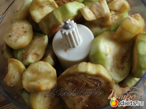 Баклажаны нарезать кружочками, хорошо посолить и оставить на 40-50 минут, пока с них выделится жидкость, затем промыть их под проточной водой, максимально отжать и измельчить в комбайне.
