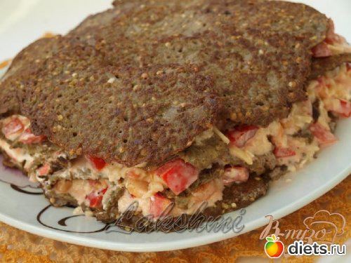 начинки. Снова слой оладий, снова начинку, опять оладьи, начинку и