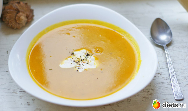 При подаче на стол, в тарелку с тыквенным супом-пюре можно добавить ложку сметаны.