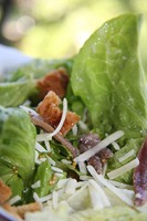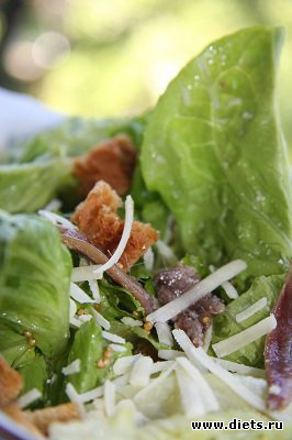 Салат ромэн промыть, порвать на крупные куски, заправить соусом, добавить креветки, перемешать, выложить на тарелку. Добавить маслины, анчоусы, гренки, сыр и помидоры.