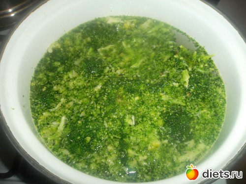 Брокколи вместе с бульоном, горошек, сыр: все кладем в блендер и измельчаем!
