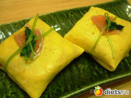 Переложить на блюдо. Так же приготовить еще 3 омлета. Дать им остыть.