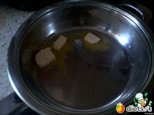Теперь в сковороде будем готовить карамельную массу! Для этого кладем 3 кубика масла (что отложили вначале)... выливаем 2 банки сгущенки.