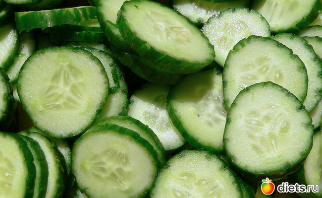 Огурец на 95% состоит из воды, которая занимает много места в желудке и тем самым усиливает чувство насыщения. Кроме того, в состав огурцов входят витамины К и С, калий, а также кремний, который участвует в построении соединительной ткани – мышц, сухожилий, связок и костей.