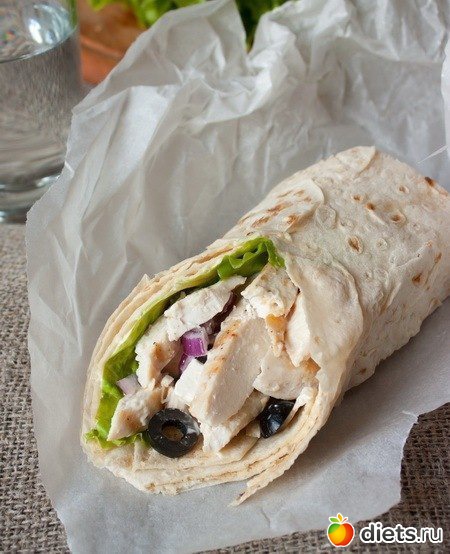 - Лаваши смазываем соусом дзадзыки ( vk.com/wall-32509740_206194 ). На каждый кладем по 3 листа салата, половину курятины, феты, лука и маслин.