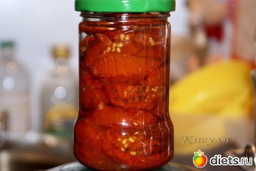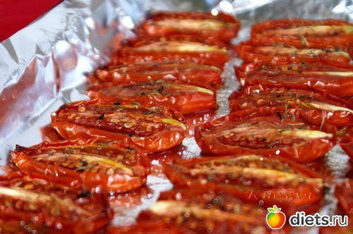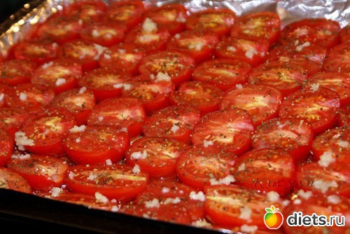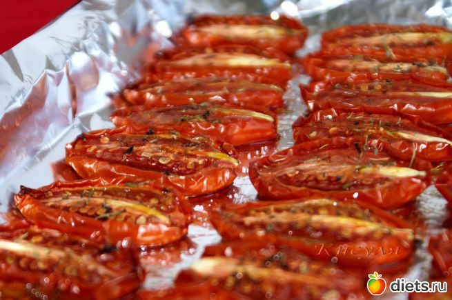 Противень застелить фольгой, чтобы меньше мыть ( блестящей стороной вверх). Разложить половинки помидор срезом вверх, посолить солью, посыпать перцем и сухим базиликом ( можно другими пряными травками) и немного “посолить” сахаром. Особенно, если томаты не из южных земель. Соль- консервант, сахар тоже. Полить помидоры из ложки оливковым маслом. Выдавить через пресс два зубчика чеснока и произвольно “разбросать” на помидоры, куда попадёт.