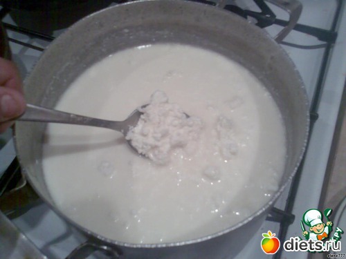 Чтобы получился хороший сыр, творог должен быть сухой и не жирный. Положить в молоко творог и нагревать до кипения и варить 7-10 минут, периодически помешивая. Если творог был не жирный и сухой, то он сразу начнёт слегка плавиться и немного тянуться.