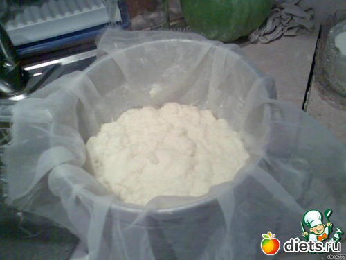 Готовую массу откинуть на дуршлаг, застеленный марлей. Дать стечь жидкости. На ощупь масса будет похожа на мягкий тянучий пластилин. С такого варёного творога жидкость стекает 2-3 минуты. Чтобы процесс ускорить, можно массу отжать руками.