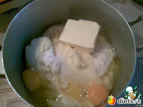 В отдельную посуду с толстым дном, но не эмалированную, положить стёкший творог, яйца, масло, соль, соду и всё тщательно перемешать руками.