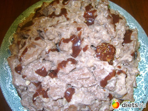 Было: сметаны 2/3 баночки, сгущенки 1/4 баночки, 3 яйца, 4 ст.ложки "Несквика", 1,5 стакана муки, 0,5 стакана крахмала, 1 стакан сахара, разрыхлитель - это всё в тесто, на крем: 3/4 банки сгущенки + 1/2 пачки масла сливочного + 2/3 пачки масла шоколадного + горсть грецких орехов. Да ещё поднялся в духовке неравномерно, на ходу пришлось перестраиваться: разрезала на два коржа - нижний примерно 1 см. толщиной, а верхний - порезала кусочками, перемешала с кремом и сверху живописной кучкой выложила, потом полоску шоколада в микроволновке растопила и сверху красивыми каплями накапала! (художник...