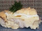 Рыбу достать из бульона, в котором она варилась, положить в форму для запекания, залить соусом.