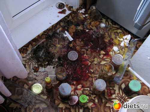 В общем, на верхней полке холодильника стояли всякие варенья-соленья (и черт меня дернул их туда поставить?), полка не выдержала, рухнула, по пути зацепив 10-к яиц, горчицу, кетчуп и маску для лица. Все это смешалось на полу в неопределенную жижу