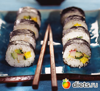 Придерживая пальцами начинку, свернуть нори с рисом в рулет.