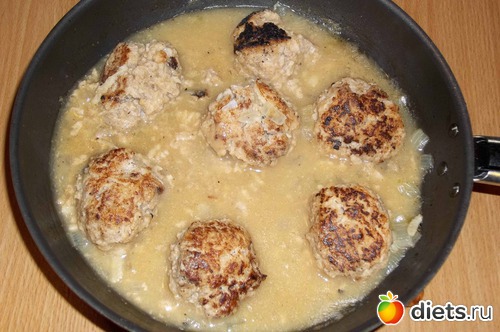 500 г фарша (у меня говяжий), луковицу размолола в бендере, яблоко очистить и на крупной терке (сбрызнуть отжатым соком 1/2 лимона). Все смешиваешь, солишь, перчишь. Обжариваешь на сильном огне, заливаешь соусом и тушишь минут 15.
