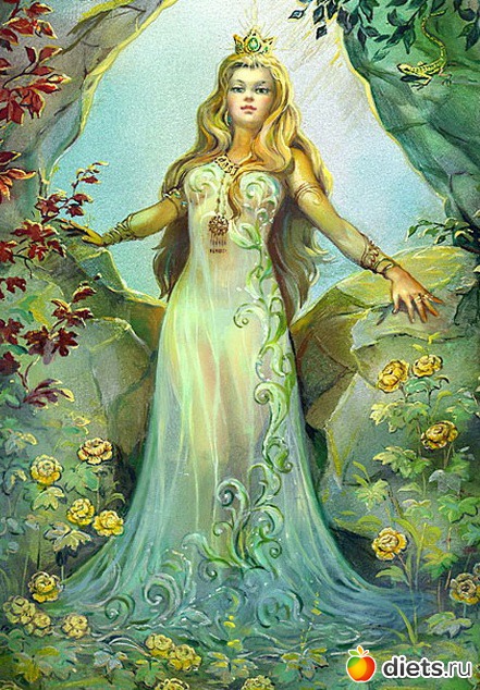 Хозяйка Медной горы. Живет среди камней, что положительно отразилось на ее внешности, а малахит, кстати, носили даже фараоны древнего Египта - считалось, что он способствует мудрости правления. Поэтому если хотим подпитаться дополнительной энергетикой, покупаем украшения из натурального камня или какую-нибудь симпатичную безделушку. У меня, например, есть массажер для лица из нефрита - приятно и польза!
