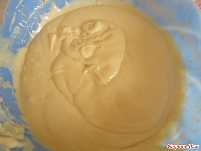 Добавляем разрыхлитель, ванилин и взбиваем еще минут пять. Получается вот такая густая смесь.