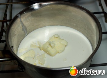 Ставим на плиту и, помешивая, доводим до кипения и растворения масла.