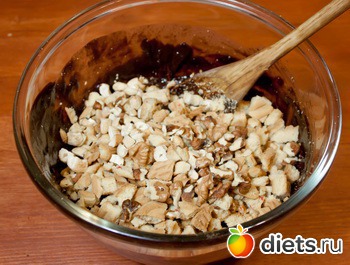 Добавляем печенье, орехи и белый шоколад, перемешиваем.