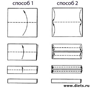 3. Очень просто сложить платок полоской, и это тоже можно сделать двумя способами. В первом случае сложите платок по штриховой линии, а затем складывайте, как показано на схеме до тех пор, пока не получите полоску нужной вам ширины.