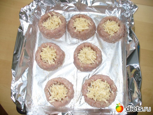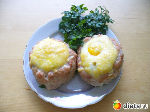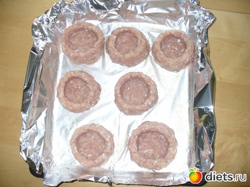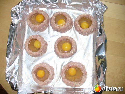 У меня фарш магазинный был и жидковатый какой-то я его овсянкой засыпала(чтобы влагу впитала. Налепила 6 гнёздышек - но не уделила внимания бортикам должного - нужно было повыше сделать и покрепче - 2 вообще растеклись - я потом уже запечёное яичко на место положила как - будто так и надо