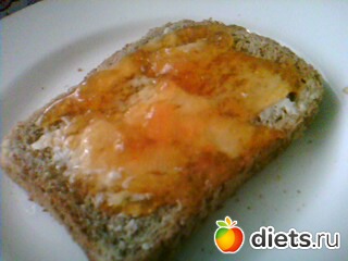 На завтрак - творожок с домашним абрикосовым пюре и цельнозерновой тост с маслом и с ним же: