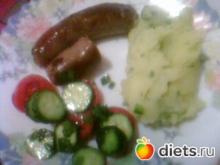 На ужин у нас были говяжьи купаты, картофельная пюрешка и помидоры-огурцы: