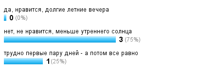 Кажется, очень остро осознала - почему я не хочу перевода на летнее время... Утром просыпаюсь - в окно светит солнце, уже в начале февраля, выхожу на улицу - солнечно, свежо, безветрено - красота. К вечеру - меньше сил, накапливается усталость за день, тем более у нас часто бывают ветра... Приходишь после работы - и радости от долгого вечернего солнца мало! Вечером уже отдыхать пора. Даже сейчас, когда сижу дома с маленьким ребенком - все равно вечером удовольствия от солнца меньше, чем утром. Видимо, потому, что я явный жаворонок - с утра могу свернуть горы, а вечером мне нужно сидеть и не шевелиться.