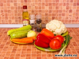 1-баклажан-100-150 гр.;1-кабачок-100-150 гр ;лук репчатый 50-70-гр.(1 или 2 средних гол.), 300гр- цветной капусты, 300-350гр - томата(помидоры);100гр - масло оливковое или подсолнечное, чеснока-небольшая голова.-50 гр; 200-250гр- перец сладкий красный и петрушки - пучок. Можно и больше брать по весу и колл.-ву овощей, но я готовлю для себя.так же добавлять в рагу можно любые овощи по вкусу, мне нравится именно с этими овощами. Сверху посыпала зеленым луком. Получилось низкокаллорийное рагу.(морковь на любителя ), но я не стала добавлять.