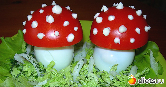 Сначала делаем салат, выкладываем в тарелку. Затем отвариваем яйца. Немножко срезаем носик у яиц, ставим их в салат срезанной частью в вверх. Делее нарезаем помидоры пополам(чтоб были похожи на круглешок). Затем половинки помидор одеваем на яйцо, по желанию можно сделать мухомор украсив шляпку гриба майонезом, горчицей или сметаной. Всё готово! С верху можно тихонько прилепить к майонезу, сметане или горчице какой-нибудь листик.