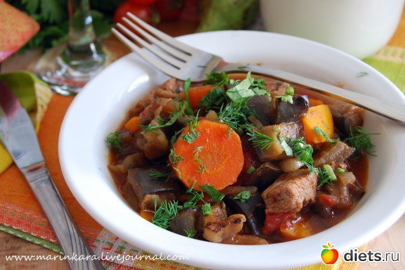 Мясо порезать небольшими кусочками или полосками. Баклажаны порезать крупными кубиками, посыпать 1 ст.л соли, оставить на 30-40 минут. После чего промыть и отжать. Обжарить баклажаны, положить на бумажное полотенце. Морковь и лук порезать кольцами или полукольцами. Сладкий перец порезать средними кубиками. Чили очистить от семян и мелко порезать. Выдавить чеснок или мелко порезать.