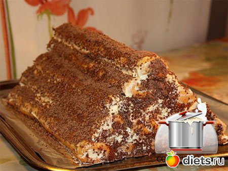 5. На блюде выкладываем 5 трубочек, смазываем кремом, затем 4 и крем, и так далее. Сверху должна получиться одна трубочка. Сверху торт смазать кремом и посыпать тертым шоколадом. Торт Монастырская изба готов!