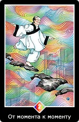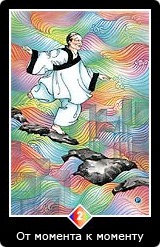 Когда этот человек движется по камням, он ступает легко и несерьезно, и, в то же время, совершенно сбалансированно и бдительно. За водоворотом вечно меняющихся вод видны силуэты здании, на заднем плане виден город. Этот человек остается в миру и в то же время вне его, сохраняет свой баланс и способен наблюдать за всем сверху. Эта карта требует, чтобы мы оставались бдительными к тому, что происходит здесь и сейчас, не вовлекаясь в другие пространства и времена. Жизнь — это великий океан. В нем вы можете играть, если оставите все свои суждения, предпочтения и далеко идущие планы. Что бы вам ни встретилось на пути, будьте доступны. И не волнуйтесь, если вы споткнетесь или упадете. Просто встаньте, отряхнитесь, улыбнитесь и идите дальше.