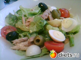 Обед - салат "Ницца" (там и салат, и тунец, и картофель, и зеленая фасоль, и помидорчики, и 2 перепелиных яичка, и оливки):