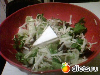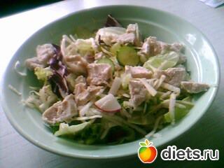 1 небольшой корешок и 1-2 стебля сельдерея, 4 редиски, 1 маленький сладкий красный перчик, 50 г огурца, 75 г белого винограда (или 1 яблоко) порезать и все перемешать, заправить лимонным соком, можно добавить чуть соли и сухих трав или зелени.