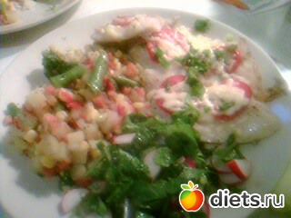 Ужин - 175 г запеченной тилапии с помидором и капелькой сыра, овощи по-деревенски, редиска с листьями и лимоном