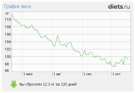 Мой вес: 112,6 - 106,5 - 102,6 кг - 100,3 кг - 99,2 кг (итого минус 13,4 кг).