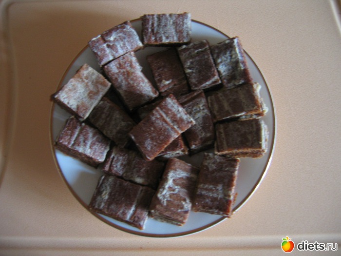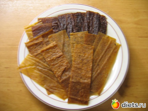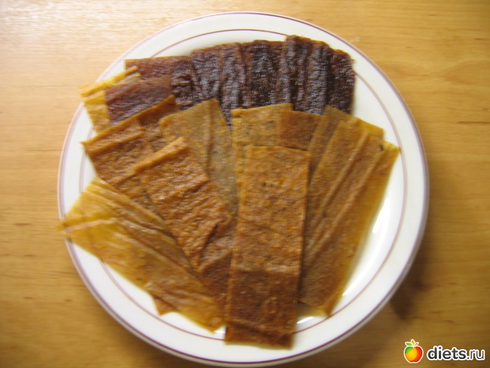 Это просто прокрученное через мясорубку пюре, без сахара, разложить на ту же бумагу и поставить на ночь, те же 7 часов. Может можно и меньше времени в духовке держать, но в моей быстрее не высыхает. Слой 6-7 мм. Для нас стройнеющих девушек лучшие конфетки