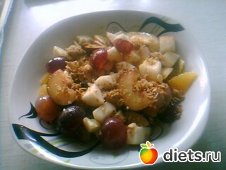 1 большой сочный апельсин, 1 красное яблоко, 110 г белого винограда (или столько же дыни), 1 груша (или персик, или нектарин), 2 ч. л. жидкого меда, 1 десертная ложка лимонного сока - фрукты нарезать кубиками и перемешать с медом и лимонным соком, дать постоять примерно час, чтобы фрукты пропитались соком.