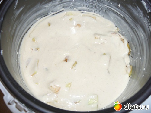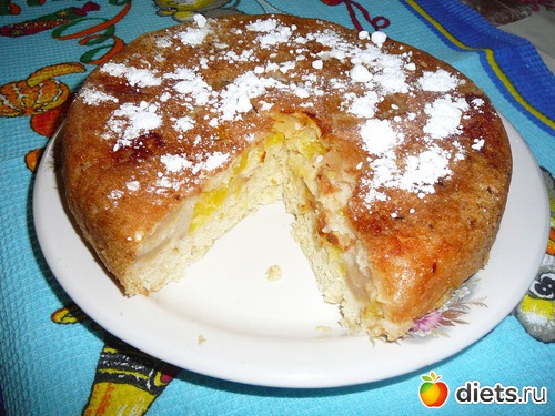 Готовить в режиме выпечка 65 минут. Готовность проверить зубочисткой. По окончанию, выключить прибор, открыть крышку. Готовую шарлотку оставить на 2-3 минуты. Дно выпечки будет верхом ( пирог-перевертыш). Сверху посыпать сахарной пудрой и украсить
