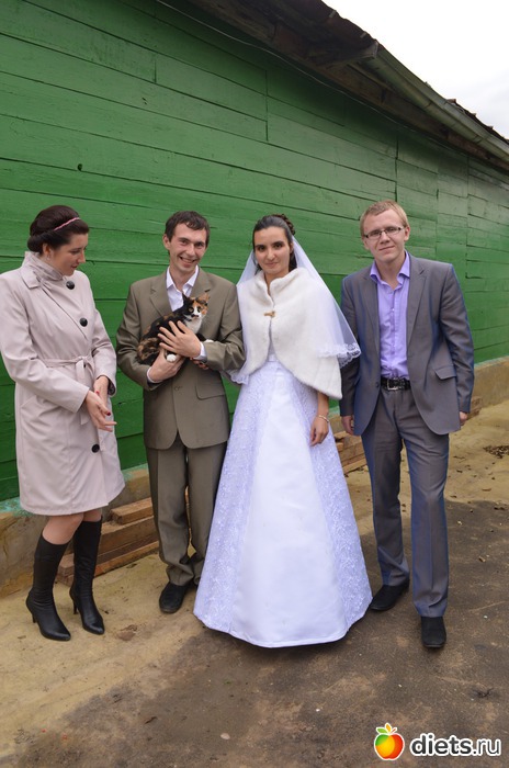 У дома со свидетелями и кошкой Лапкой. Она такая трусиха, что весь день боялась зайти в дом, полный гостей, даже еду ей выносили на улицу.