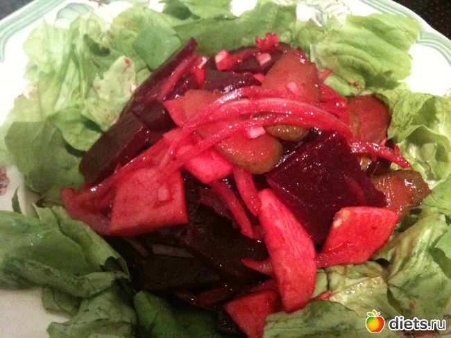 Вчера вечером на местном телеканале в передаче "Идеальный ужин" увидела интересный рецепт салата из свеклы с грушей, сегодня приготовила на обед - мне понравилось. Возможно понравится и вам. В оригинальном варианте калорийность получается 132ккал на 100г, для снижения калорийности можно оливковое масло заменить йогуртовой заправкой, тогда получается всего 100ккал.