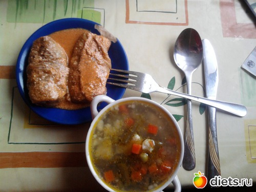 Обед состоял из овощного супчика с 2мя мясо-овощными голубцами. Обедала поздно после массажа с малышами. Думала, что не удержусь и начну хватать на ходу. Но, удержалась. Зато 2 голубца смолотила.