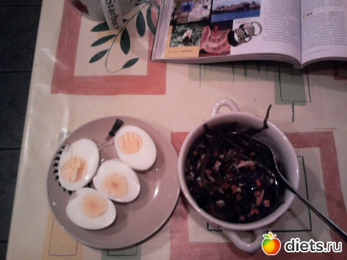 После плотного обеда, хотелось облегчить ужин. Решила поесть яйца вареные в смятку и салат из морской капусты.