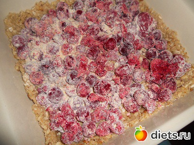 в ягоды(у меня вишня и малина)добавить кукурузную муку, орехи, размягченное масло, слегка перемешиваем руками, чтобы не повредить ягоды, ягоды можно добавить любые по вашему вкусу... Ягодную смесь выкласть на основу из теста в форме, распределить ровным слоем...