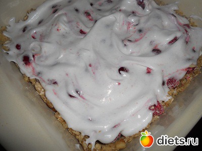 Теперь берем белки и начинаем взбивать с щепоткой соли, добавляем 2ст. л. сахара и взбиваем до мягких пиков, взбитые белки распределяем по ягодам ровным слоем