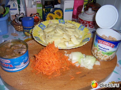 Денег в кошельке мало, на мясо не хватает и подруга посоветовала такой супчик сварить. Сайра консервированная в масле, фасоль консервированная и картошка... Я добавила лук, морковку и укропа для цвета.