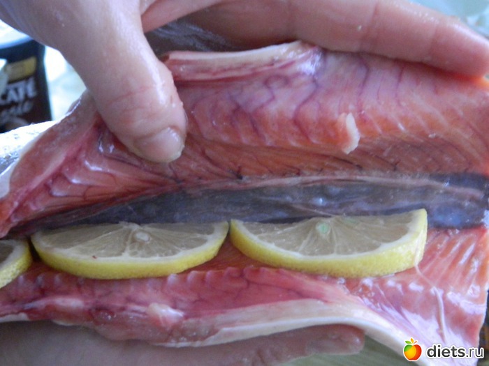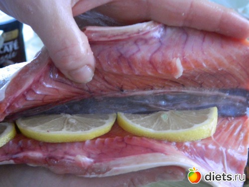 Рыбу посолить, поперчить, нафаршировать лимоном.