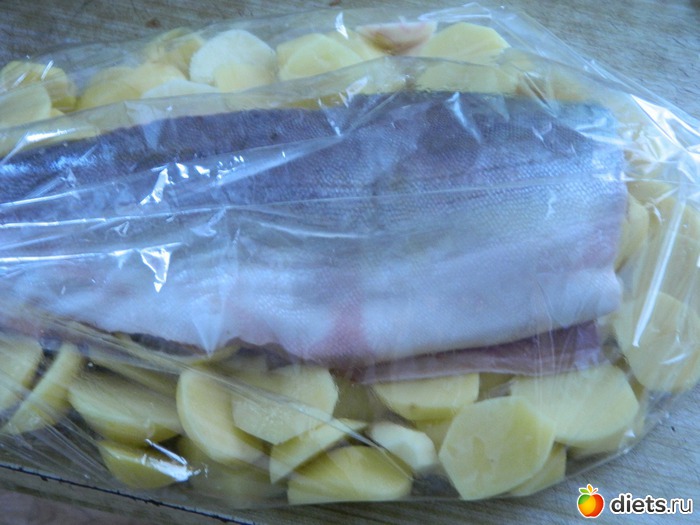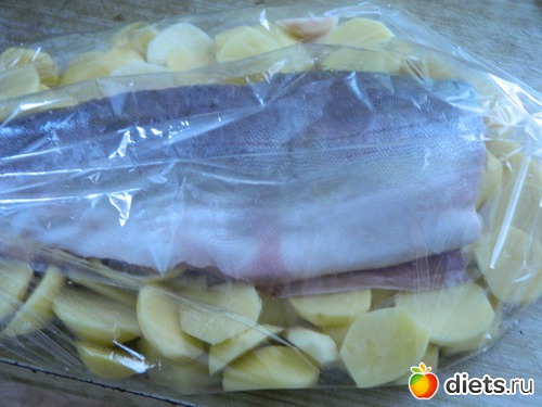 Поскольку калорийность горбуши, приготовленной в рукаве составляет на 100 г блюда всего 98,1 ккал, Б - 18,1, Ж - 2,9, У - 0 (учитывалась именно рыба - без картофеля!)
