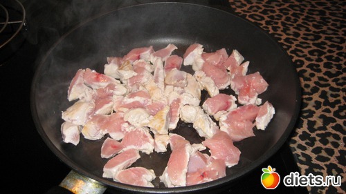 Филе индейки нарезать небольшими кусочками и очень быстро обжарить на сухой сковороде до того момента пока мясо не побелеет